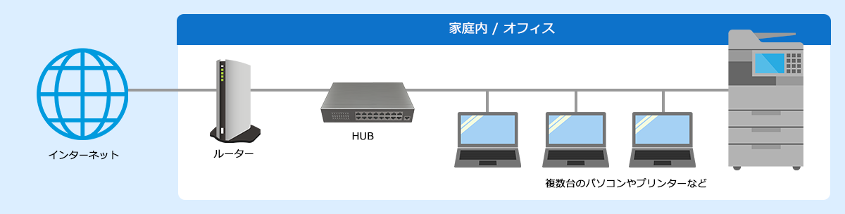 ローカルエリアネットワーク(Local Area Netwark)の略であるLANは、家庭内・オフィス内などで構成された小規模なネットワークの総称です。